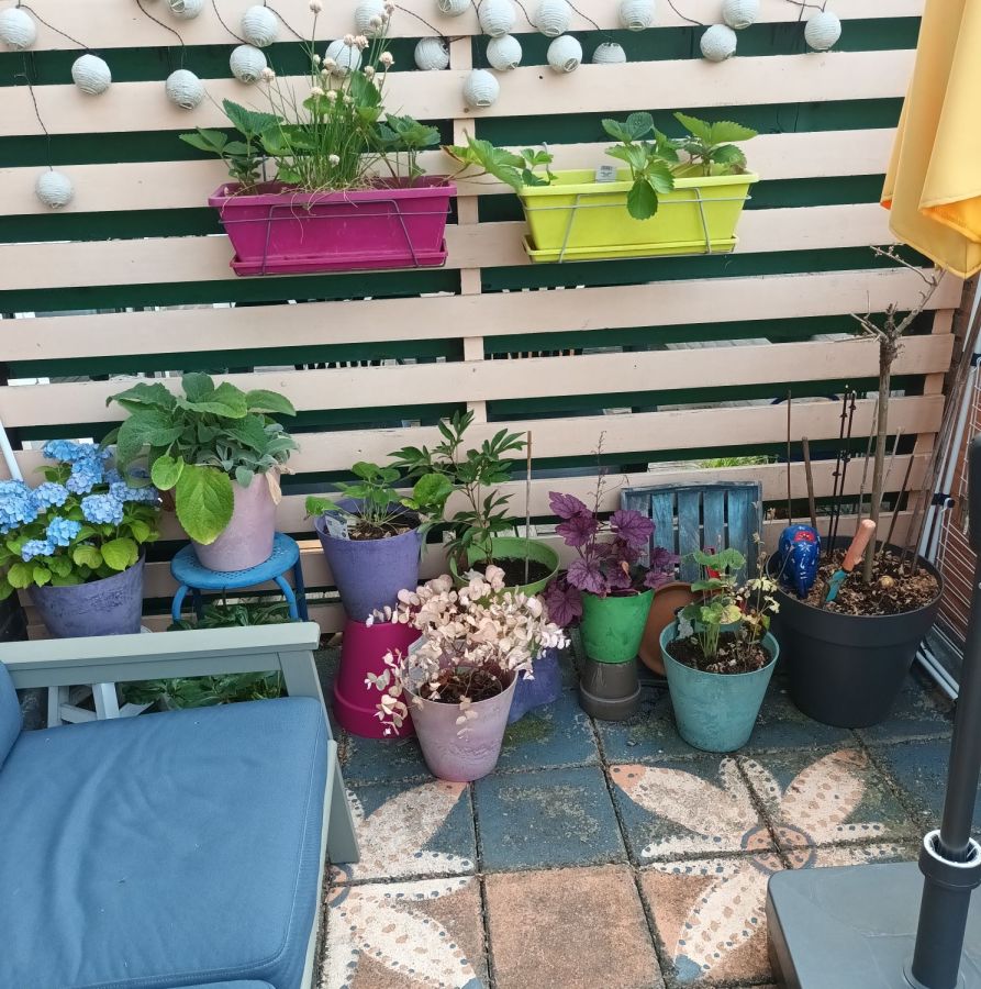 Dat is het tegenwoordig in sommige tuinen ook… maar het doet me deugd te zien hoe je je best doet, en hoe je balkon er toch heel erg ‘fris & fruitig’ uitziet!