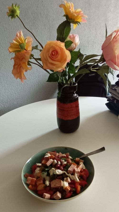Heerlijk lunchsalades. Ik had bij een Too God To Go pakket 2 bakjes eiersalade al op datum dus die moeten beetje snel op. Heb het gebruikt in een witlof-augurkensalade. En nog wat plakjes metworst die ook al lang in de vriezer lagen, even in de pan gebakken en lekker erover,