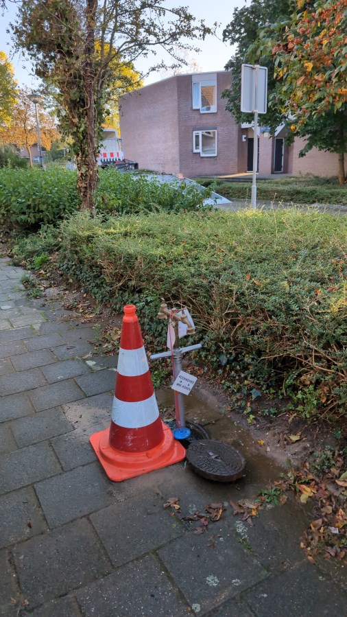Ik maak een foto, zet deze met uitleg waar de kraan staat (en dat het water pas geschikt is voor consumptie wanneer het 3 minuten heeft gekookt maar dat je het zo kunt gebruiken om de wc door te spoelen) in de app, loop naar binnen, pak een emmer en ga water tappen. Ik ben niet de eerste. Een van de bewoners van het naastgelegen huizenblok is mij voor. Wat hebben we het goed in Nederland hé, zegt zij, dat we door zoiets kleins als een stukje lopen voordat je water hebt al zo van de wap zijn.