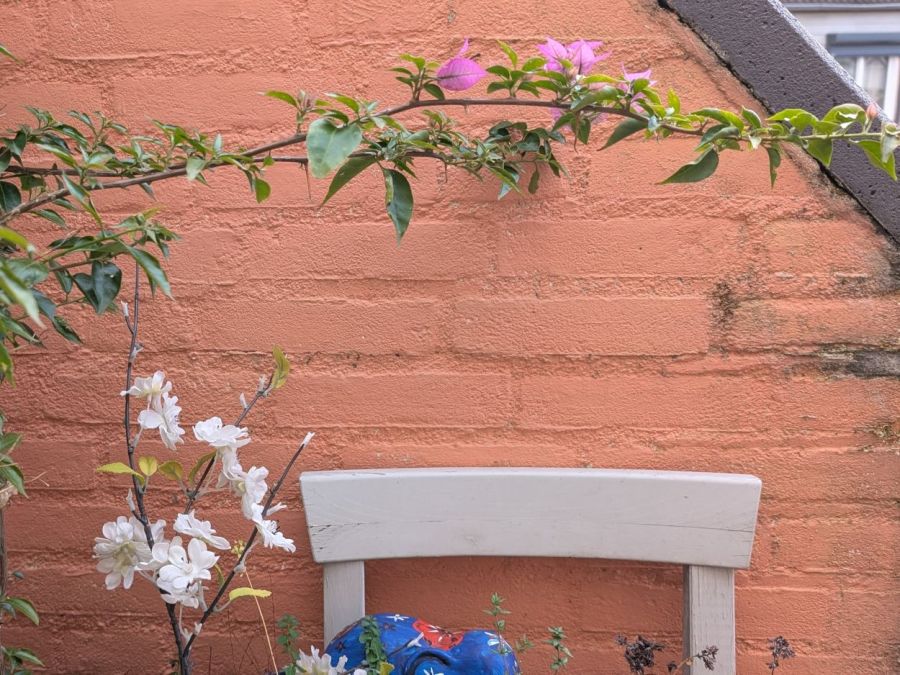 Het exemplaar van dit jaar was groter en minder straks opgebonden. Dat lijkt het ei van Columbus te zijn want … de B-villea heeft zomaar een zomer overleefd. Niet alleen dat, de plant is duidelijk groter en wilder geworden en er zitten zelfs nog een paar bloemen in.