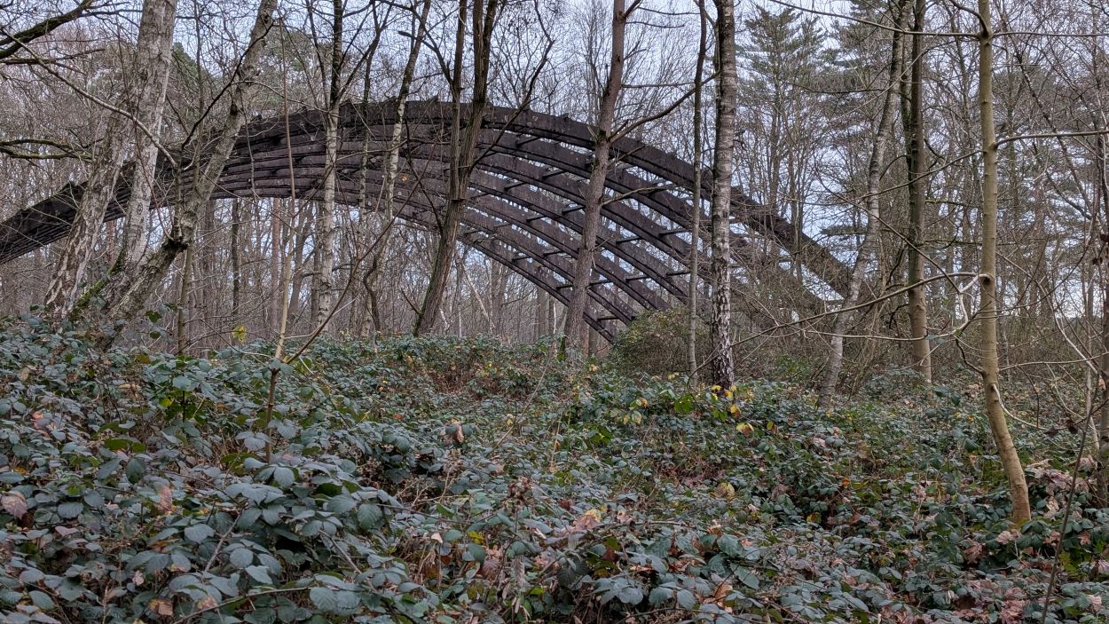 Interessant, maar niet de reden van mijn komst. Ik ging terug naar het hoofdpad en wandelde verder. Op afstand zag ik de boog al tussen de bomen door schimmeren.