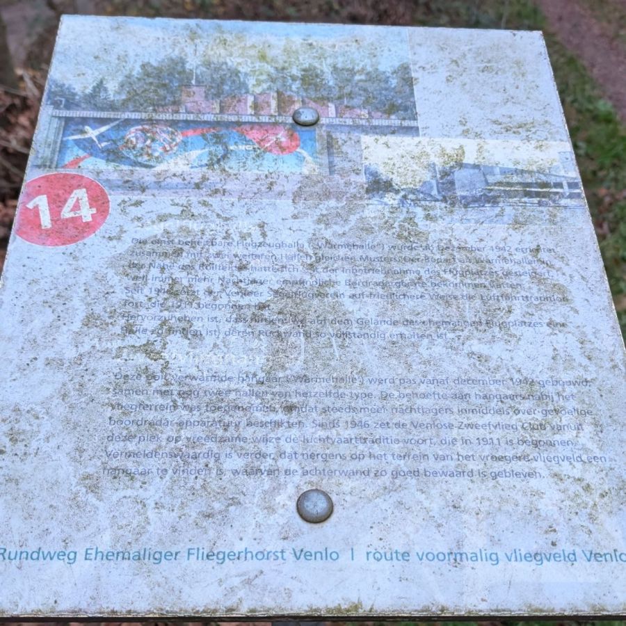 Met nog anderhalve kilometer te gaan ging mijn verstand op nul en blik op oneindig. Ik begon het koud te krijgen. In de verte zag ik twee hangaars met zweefvliegtuigen liggen. Een plek waar ik langs moet lopen. Ik maakte een foto, keek nog eens goed naar de hangaar aan de rechterkant en dacht Dat lijkt op de ruïne van de verwarmde hangaar. Het was even zoeken naar een informatiebord maar wat denk je? Ik had gelijk.
